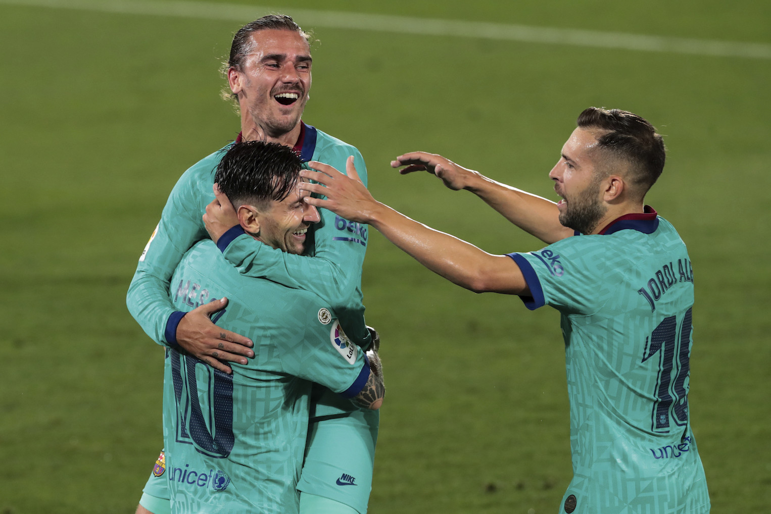 Griezmann comemora com Messi e Alba o golaço que marcou contra o Villarreal, pela Liga Espanhola.