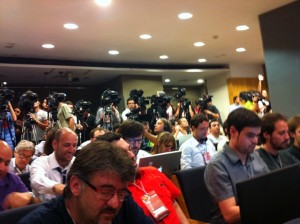 24/05/2011 0 A sala de imprensa Ricard Maxenchs do estádio Camp Nou, em Barcelona, ficou lotada para a coletiva do técnico Pep Guardiola. Foto: LD Sport News O técnico Pep Guardiola entrou na sala de imprensa Ricard Maxenchs do estádio Camp Nou, nesta segunda-feira, em Barcelona, para a última entrevista coletiva em solo espanhol antes da final de Wembley. A decisão do próximo sábado, em Londres, contra o Manchester United não sai da cabeça do treinador. Um dos detalhes que ele fez questão de destacar é que deseja contar com a torcida do Barça na capital inglesa. “Espero que nosso torcedores possam viajar. Não teria sentido jogar a final sem eles”. O problema surgiu após um vulcão da Islândia entrar em erupção no último fim de semana. A nuvem de cinzas lançada por ele pode fechar o espaço aéreo europeu nos próximos dias, o que deixaria a torcida do Barça numa situação complicada. Sobre os planos do time com relação ao assunto, Guardiola revelou que aguardará novas informações. “Se tudo sigue normal, viajamos na quinta, mas vamos esperar para ver o que dirão os especialistas”. Com relação ao adversário, Guardiola afirmou não acreditar que os ´Diabos Vermelhos´ adotem uma tática similar a que usou o Real Madrid contra o Barça nas semifinais. “Estamos falando do Manchester United, um dos maiores times da história. Creio que se verá uma grande final e não acredito que eles façam um jogo especulativo. Mas no futebol tudo é possível”. Guardiola pensativo durante a entrevista coletiva. Foto: LD Sport News O técnico do Barça não vê o Man. United atual mais fraco que o de 2009 por não poder contar mais com Cristiano Ronaldo, que se transferiu ao Real Madri. “Só saiu ele, o resto são os mesmos. E agora, além de Rooney, eles possuem no ataque Berbatov e Chicharito, em grande forma. A equipe atual do Manchester é completa e são muito perigosos”. Guardiola só buscou ser mais discreto quando lhe perguntaram sobre o time titular para o jogo do próximo sábado. “Tenho pensado uma base para escalar a equipe. Mas só vou definir o time após os treinos dessa semana. É quando verei quem está em melhores condições para essa partida”. O fato dos principais jogadores estarem muitos dias sem jogar não preocupa o técnico do Barcelona. Eles foram poupados nos jogos restantes da Liga Espanhola após o Barcelona conquistar o tricampeonato da competição. “Não acredito que eles percam o ritmo por estarem sem jogar. Todos sabem a importância dessa partida e estou certo que entrarão em campo com toda a vontade do mundo, sem dúvida”. Tags: champions league, fc barcelona, Pep Guardiola