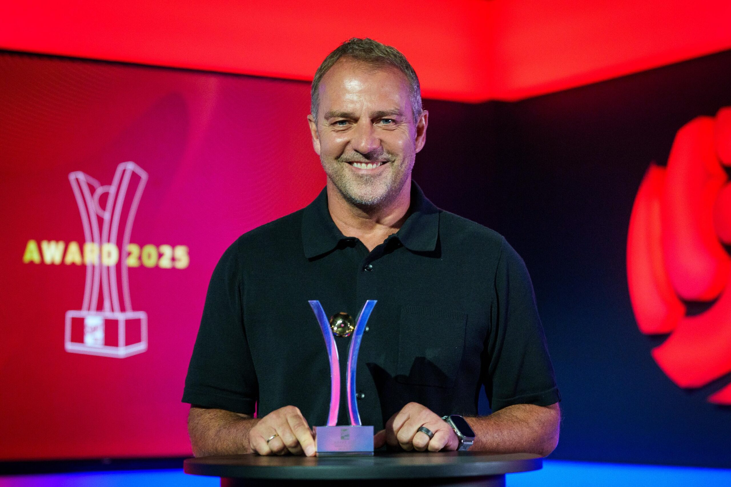 25/08/2025 0 O técnico Hnsi Flick sorrindo para a câmera e segurando o prêmio de Melhor Técnico com ambas as mãos.