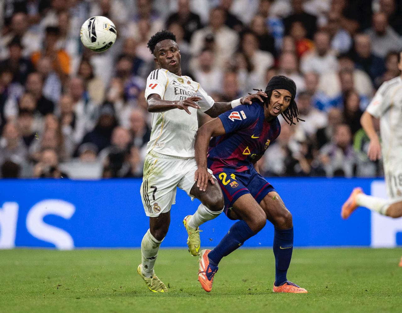 26/10/2025 0 Vinícius Jr. e Kounde lutam por uma bola durante o clássico da 10ª rodada da Liga, no Bernabéu. / Ricardo Nogueira
